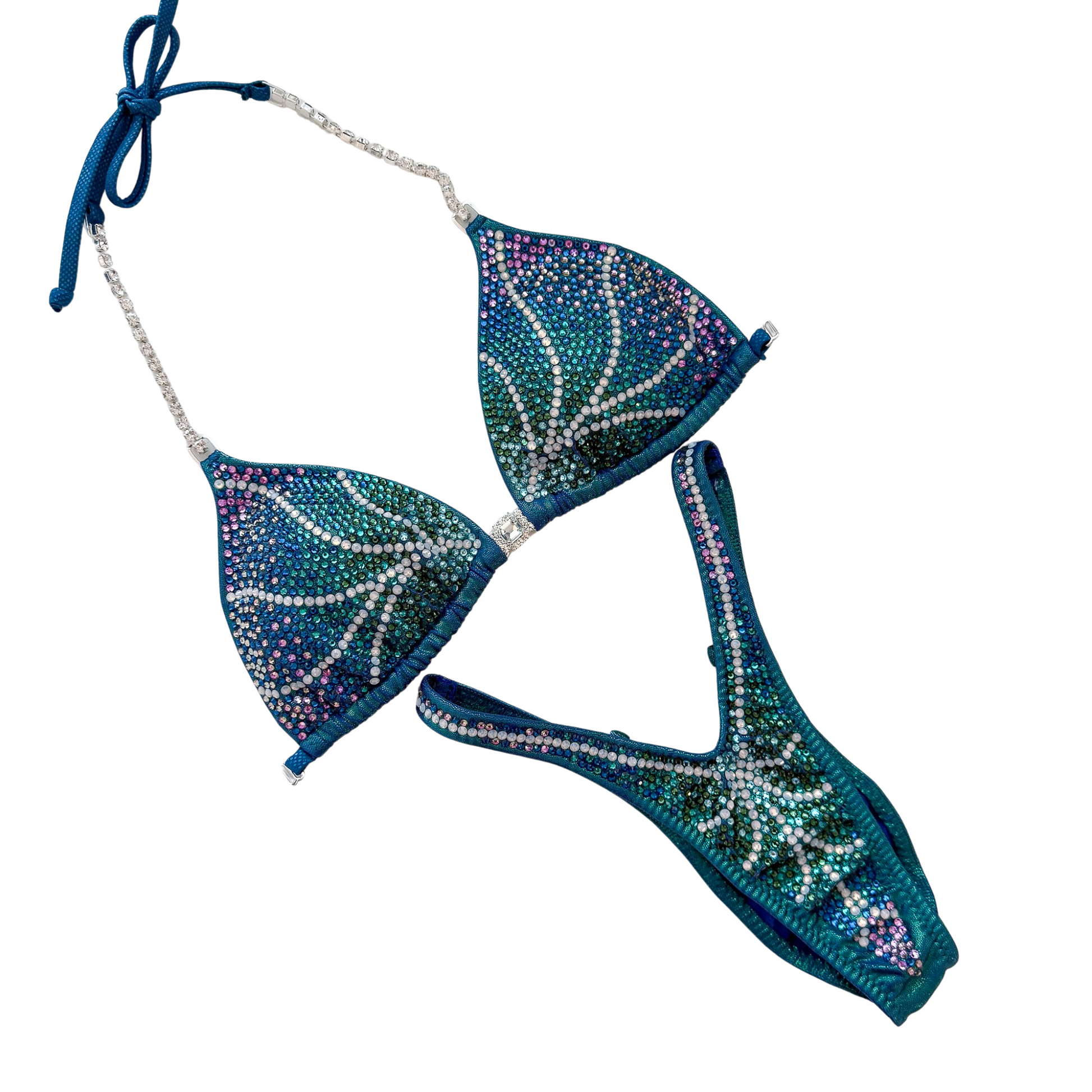 Our Commissioned Design is a fully stoned suit design inspired by mermaid shells. We recommend selecting a line crystal that will pop out against the rest of the suit for the best results.