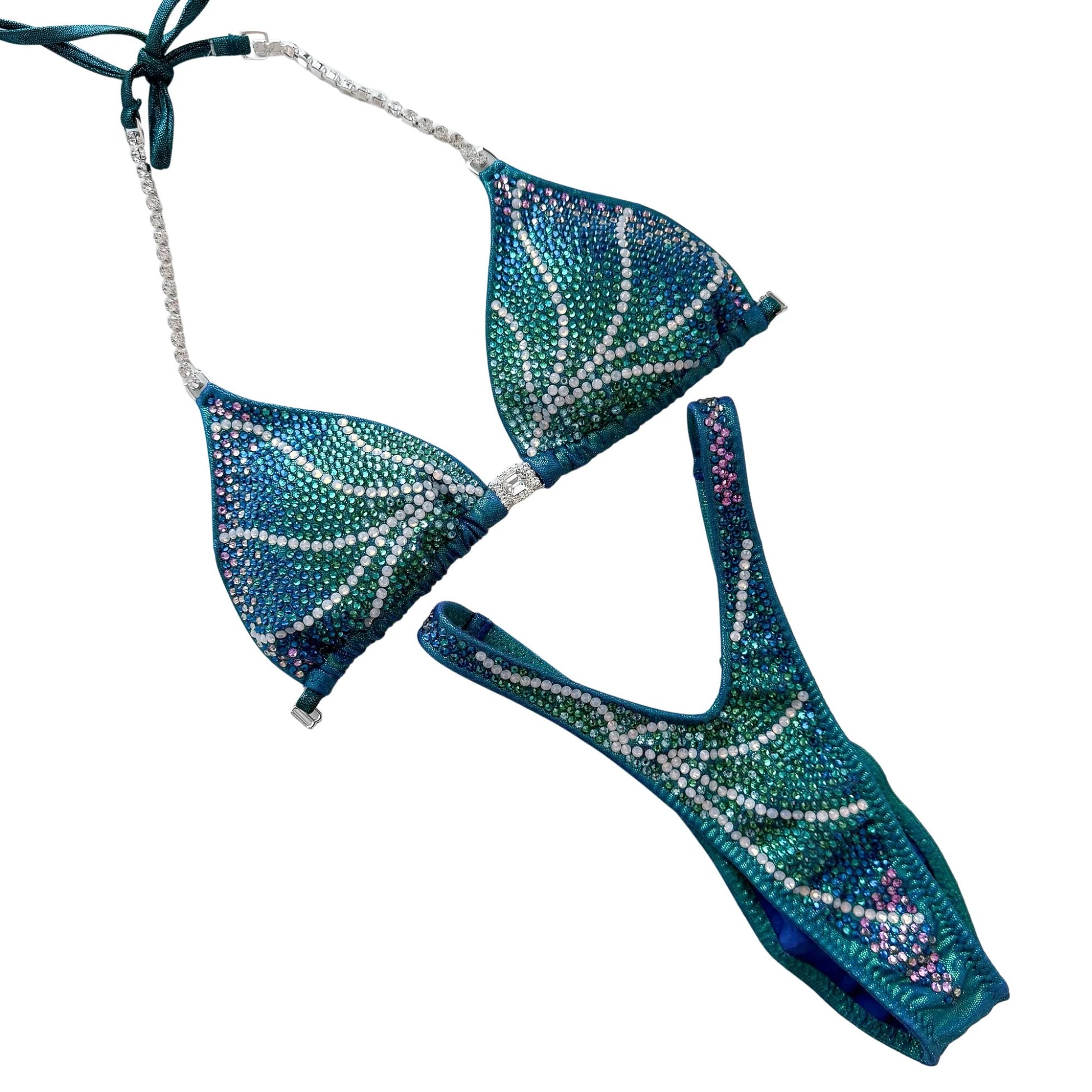 Our Commissioned Design is a fully stoned suit design inspired by mermaid shells.