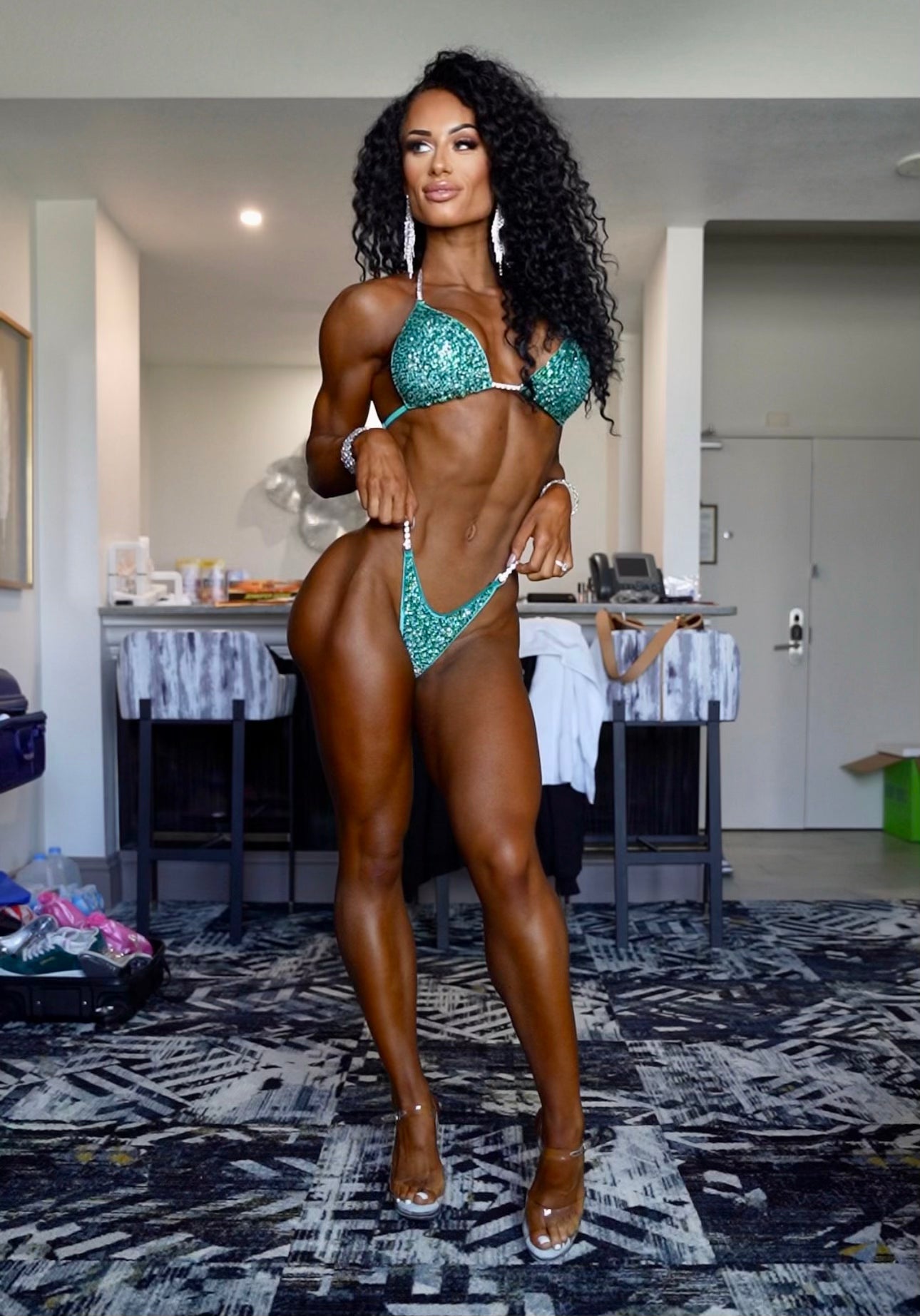 2x Olympia champion, Jennifer Dorie, wins her 2nd Olympia title in her new teal suit! We love creating this teal base with a focus on more green-shades for the crystals to bring out more of a green sparkle on stage! Our Full Scatter design is one of our fully stoned designs that have two different sizes of crystals scattered randomly on the suit. Click here to shop this suit in the Figure/Physique version.