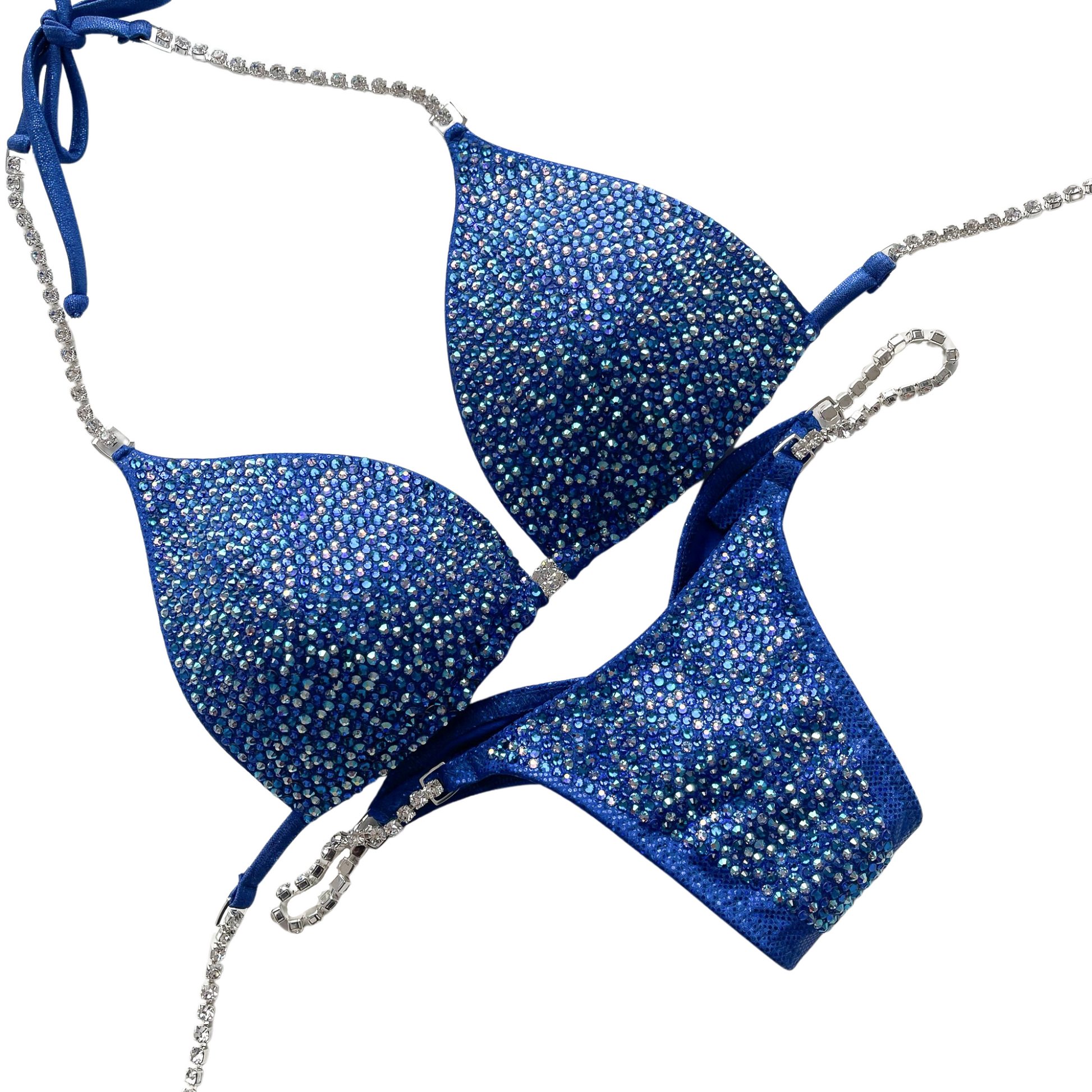 The Full Scatter design is a fully stoned design that has two different sized crystals (16ss and 20ss) randomly scattered on the suit for a dimensional effect.