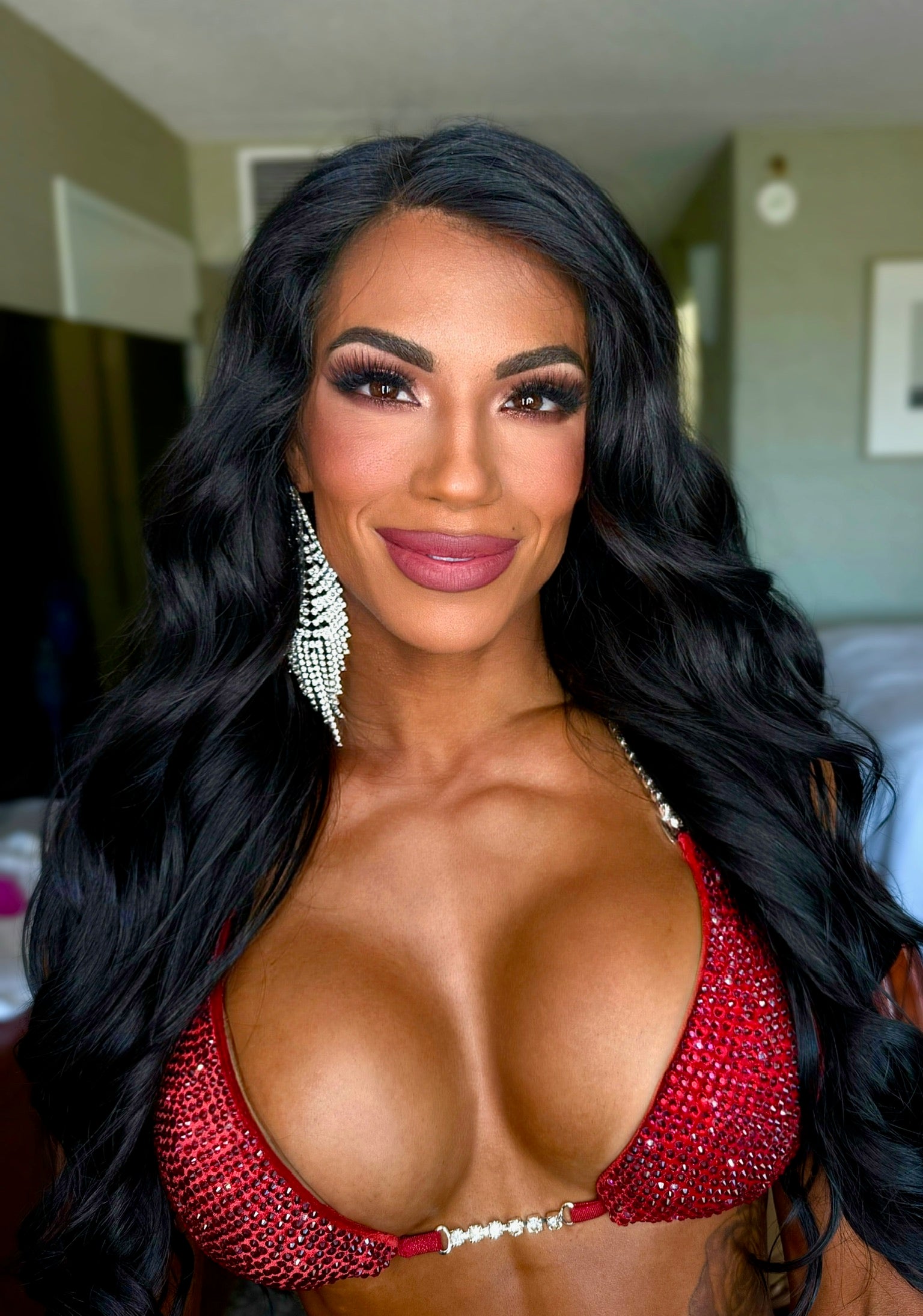 Olympian, Aimee Delgado, came back to the Pittsburgh Pro 2025 and defended her title. Not only did she took home the 3X Pittsburgh Bikini Champ, but this qualified her for the 2025 Olympia as well! The Full Scatter design is a fully stoned design that has two different sized crystals (16ss and 20ss) randomly scattered on the suit for a dimensional effect. We recommend selecting between 1-5 different crystal colors for the best result.